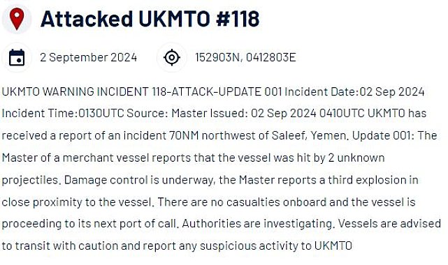Vahdet AYAZ, (DHA)- BİRLEŞİK Krallık Deniz Ticareti Operasyonları (UMKTO), Kızıldeniz'de ticari bir geminin tespit edilemeyen iki mühimmat ile vurulduğunu duyurdu
