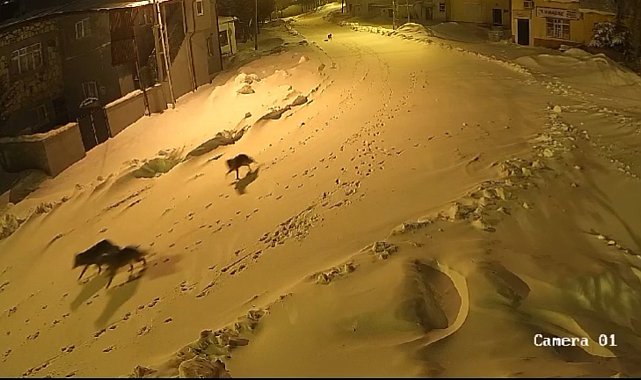 BAYBURT'ta, kar yağışı nedeniyle yiyecek bulamayan kurt sürüsü köye indi. O anlar güvenlik kamerasına yansıdı.Kentte etkili olan kar yağışı ve soğuk hava, yaban hayatını da olumsuz etkiledi. Karla kaplanan yüksek kesimlerde aç kalan kurtlar, yerleşim yerine inip yiyecek aradı. Merkez ilçeye bağlı Çayıryolu köyüne inen kurtların sürü halinde dolaşıp yiyecek aradığı anlar, çevredeki güvenlik kamerasına yansıdı.