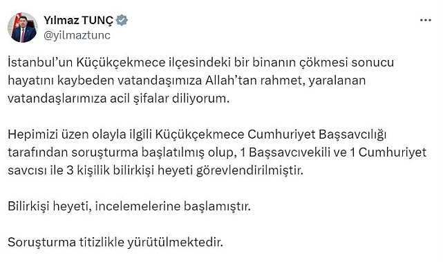 ADALET Bakanı Yılmaz Tunç, İstanbul'un Küçükçekmece ilçesinde çöken bina ile ilgili soruşturma başlatıldığını ve 3 kişilik bilirkişi heyetinin görevlendirildiğini açıkladı.Bakan Tunç, sosyal medya hesabından yaptığı açıklamada, "İstanbul'un Küçükçekmece ilçesindeki bir binanın çökmesi sonucu hayatını kaybeden vatandaşımıza Allah'tan rahmet, yaralanan vatandaşlarımıza acil şifalar diliyorum. Hepimizi üzen olayla ilgili Küçükçekmece Cumhuriyet Başsavcılığı tarafından soruşturma başlatılmış olup, 1 Başsavcıvekili ve 1 Cumhuriyet savcısı ile 3 kişilik bilirkişi heyeti görevlendirilmiştir. Bilirkişi heyeti, incelemelerine başlamıştır. Soruşturma titizlikle yürütülmektedir" dedi.