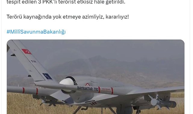ANKARA, (DHA)- MİLLİ Savunma Bakanlığı (MSB), Irak'ın kuzeyindeki Pençe-Kilit Operasyonu bölgesi ile Gara bölgesinde tespit edilen 3 PKK'lı teröristin etkisiz hale getirildiğini açıkladı
