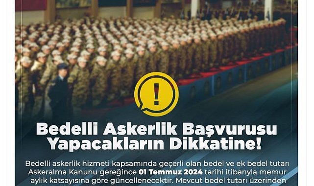 ANKARA, (DHA)- MİLLİ Savunma Bakanlığı (MSB), bedelli askerlik ücretinin 1 Temmuz'da memur aylık katsayısına göre güncelleneceğini hatırlatarak, mevcut bedel tutarı üzerinden müracaat etmek isteyenlerin 28 Haziran'a kadar başvuruda bulunması gerektiğini duyurdu