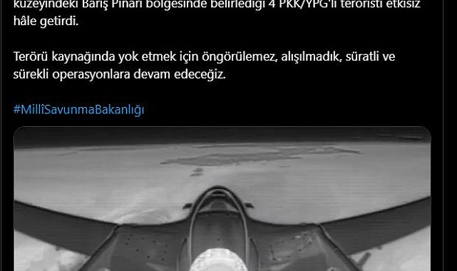 MİLLİ Savunma Bakanlığı (MSB), Irak'ın kuzeyinde 3 PKK'lı terörist ile Suriye'nin kuzeyinde 4 PKK/YPG'li teröristin etkisiz hale getirildiğini açıkladı.Bakanlığın sosyal medya hesabından yapılan açıklamada, "Terörist neredeyse hedefimiz orası. Kahraman Türk Silahlı Kuvvetlerimiz, Irak'ın kuzeyindeki Haftanin ve Pençe-Kilit Operasyonu bölgelerinde tespit ettiği 3 PKK'lı terörist ile Suriye'nin kuzeyindeki Barış Pınarı bölgesinde belirlediği 4 PKK/YPG'li teröristi etkisiz hale getirdi. Terörü kaynağında yok etmek için öngörülemez, alışılmadık, süratli ve sürekli operasyonlara devam edeceğiz" denildi.