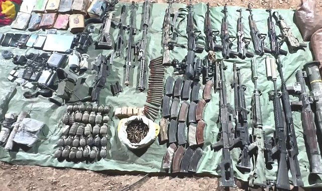 MİLLİ Savunma Bakanlığı (MSB), Pençe-Kilit Operasyonu bölgesinde teröristlere ait çok sayıda silah ve mühimmatın ele geçirildiğini açıkladı.Bakanlıktan yapılan açıklamada, "Kahraman Mehmetçiklerimiz, Pençe-Kilit Harekatı bölgesinde yürüttükleri arama tarama faaliyeti sırasında teröristler tarafından barınmak ve sığınmak amacıyla kullanılan bir mağara tespit etti. Tespit edilen mağarada çok sayıda silah, mühimmat ve yaşam malzemesi ele geçirilerek kullanılamaz hale getirildi" denildi. Ele geçirilen malzemelerin; 7 AK-47 seyyar dipçik piyade tüfeği ve 19 şarjörü, 1 AK-47 sabit dipçik piyade tüfeği, 1 AT-4 tanksavar silahı, 1 RPG-7 roketatar, 1 Dragunov keskin nişancı tüfeği, 3 M-16 piyade tüfeği, 1 PKMS makineli tüfek ve yedek namlusu, 29 adet 12,7 milimetre Doçka mühimmat, 682 adet 5,56 milimetre mühimmat, 34 el bombası, 1 keskin nişancı dürbünü, 2 termal silah dürbünü, 1 periskop, 1 RPG-7 gündüz görüş dürbünü, 2 sabit telsiz, 3 el telsizi, 2 dizüstü bilgisayar, 4 telefon, 3 kamera, 1 go-pro kamera, 5 fünye, 1 el jeneratörü ve örgütsel dokümanlardan oluştuğu açıklandı.