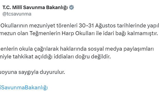 MİLLİ Savunma Bakanlığı (MSB), "Teğmenlerin okula çağrılarak haklarında sosyal medya paylaşımları nedeniyle tahkikat açıldığı iddiaları doğru değildir" açıklamasını yaptı.Bakanlığın sosyal medya hesabından yapılan açıklamada, "Harp Okullarının mezuniyet törenleri 30-31 Ağustos tarihlerinde yapılmış olup mezun olan teğmenlerin Harp Okulları ile idari bağı kalmamıştır. Teğmenlerin okula çağrılarak haklarında sosyal medya paylaşımları nedeniyle tahkikat açıldığı iddiaları doğru değildir. Kamuoyuna saygıyla duyurulur" denildi.