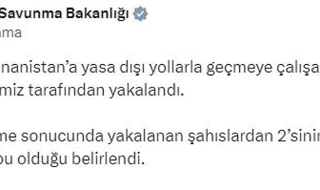 MİLLİ Savunma Bakanlığı (MSB), Türkiye'den Yunanistan'a yasa dışı yollarla geçmeye çalışan 2'si FETÖ mensubu 7 kişinin yakalandığını açıkladı. Bakanlığın sosyal medya hesabından yapılan açıklamada, "Ülkemizden Yunanistan'a yasa dışı yollarla geçmeye çalışan 7 şahıs, hudut birliklerimiz tarafından yakalandı. Yapılan inceleme sonucunda yakalanan şahıslardan 2'sinin FETÖ terör örgütü mensubu olduğu belirlendi" denildi.