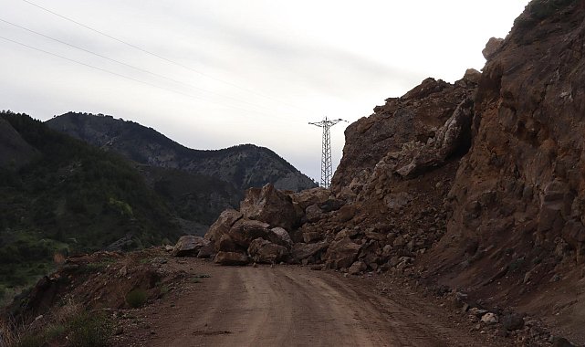 Dursun Murat AYDIN/ OLTU (Erzurum), (DHA)- ERZURUM'un Oltu ilçesinde yağış sonrası dağdan kopan kaya parçaları kırsal Kemerkaya Mahallesi'nin yolunu kapattı