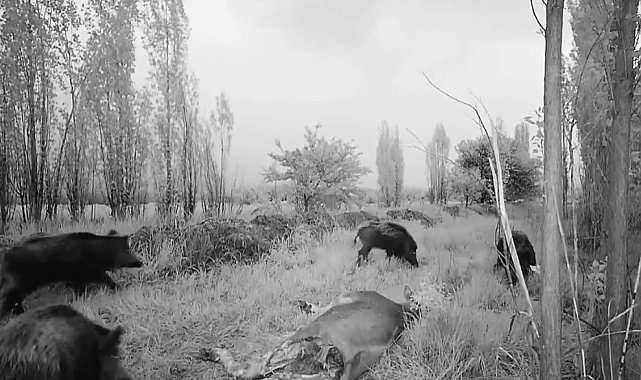 Erzincan'da popülasyonu hızla artan ve çiftçilerin mahsullerine zarar verdiği için dert yakındıkları domuz sürüsü havadan dron ile karadan da foto kapanla görüntülendi.Çayırlı ilçesinde köyün yakınına gelen domuz sürüsü, havadan dron ile görüntülendi. Arazide ilerleyen sürü daha sonra çalılıkların içerisinde yollarına devam etti. Aynı domuz sürüsü gece saatlerinde de büyükbaş hayvan leşinin yakınına kurulan foto kapan görüntülerine yansıdı.