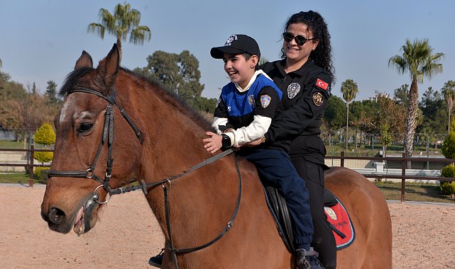ADANA'da 2'nci sınıf öğrencisi Poyraz Efe Tuaç (8), çok sevdiği atlı polisleri çizip altına da tanışmak istediği notunu eklediği resmi, İl Emniyet Müdürlüğü'ne gönderdi. Polis ekipleri, evinden aldığı Poyraz Efe'ye üniforma giydirip, ata bindirdi. Yaşadığı mutluluğu anlatan Poyraz Efe, "Polisleri sevdiğim ve onlar gibi olmak istediğim için bu resmi çizdim. Çizdiğim resim gerçek oldu" dedi.Merkez Sarıçam ilçesi Çarkıpare Mahallesi'ndeki Şehit Ertan Tokuş İlkokulu 2'nci sınıf öğrencisi Poyraz Efe Tuaç, çok sevdiği ve aralarına katılmanın hayalini kurduğu atlı polislerin resmini çizdi. Poyraz Efe, altına "Polis ağabeylerim ve ablalarım, Allah izin verirse yanınıza geleceğiz. Siz, bizi hırsızlardan korursunuz. Size kalbimizi borçluyuz" notunu eklediği resmi, Adana Emniyet Müdürlüğü'ne gönderdi. Resmi görünce duygulanan İl Emniyet Müdürü Ahmet Hakan Arıkan, Poyraz Efe'nin polislerle tanışması için talimat verdi.ÜNİFORMA GİYDİ, ATA BİNDİToplum Destekli Polislik Şube Müdürlüğü ekipleri, Sofu Dede Mahallesi'ndeki evinden aldığı Poyraz Efe ve sınıf arkadaşlarını, Atlı Polis Birlik Amirliği'nin yerleşkesine götürdü. Atlı polislerle tanışan Poyraz Efe, hediye edilen polis üniformasını giyip, selam verdi. Yerleşkede polislerle sohbet edip, vakit geçiren Poyraz Efe, daha sonra ata bindirildi. Heyecan ve mutluluğu bir arada yaşayan Poyraz Efe, polislere teşekkür edip, hatıra fotoğrafı çektirdi.'ÇİZDİĞİM RESİM GERÇEK OLDU'Büyüyünce atlı polis olmak istediğini belirten Poyraz Efe, "Çok heyecanlıyım. Hayatımda ilk defa ata bindim ve çok sevindim. Polisleri sevdiğim ve onlar gibi olmak istediğim için bu resmi çizdim. Resimde bir erkek, bir kadın polis atı koşturuyorlardı. Sonrasında resmi polislere gönderdim. Bu hayalimin gerçek olacağını düşünmüyordum. Çizdiğim resim gerçek oldu. Atlı polislere de çok teşekkür ederim" dedi.