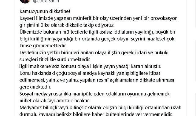 RADYO ve Televizyon Üst Kurulu (RTÜK) Başkanı Ebubekir Şahin, Kayseri'de 7 yaşındaki Suriyeli çocuğa tacizi iddiaları üzerine çıkan olaylara ilişkin, "Medyamız bilinçli veya bilinçsiz olarak oluşan bilgi kirliliği ortamından uzak durmalı, kaynağı belirsiz bilgilere haber bültenlerinde yer vermemelidir" dedi.RTÜK Başkanı Şahin, sosyal medya hesabından yaptığı açıklamada, "Kayseri ilimizde yaşanan münferit bir olay üzerinden yeni bir provokasyon girişimini ülke olarak dikkatle takip ediyoruz. Ülkemizde bulunan mültecilerle ilgili asılsız iddiaların yayıldığı, büyük bir bilgi kirliliğinin yaşandığı bir ortamda gerçek olayın seyrini maalesef çok kimse görmemektedir. Devletimizin yetkili birimleri anılan olaya ilişkin gerekli idari ve hukuki süreçleri titizlikle sürdürmektedir. İlgili mahkeme söz konusu olaya ilişkin yayın yasağı kararı almıştır. Konu hakkındaki çoğu sosyal medya kaynaklı yanlış bilgilere itibar edilmemesi, yalnız ve yalnız yapılan resmi açıklamaların dikkate alınması gerekmektedir. Sosyal medyayı ustalıkla manipüle eden odakların oyununa gelmemek millet olarak faydamıza olacaktır. Medyamız bilinçli veya bilinçsiz olarak oluşan bilgi kirliliği ortamından uzak durmalı, kaynağı belirsiz bilgilere haber bültenlerinde yer vermemelidir" dedi.