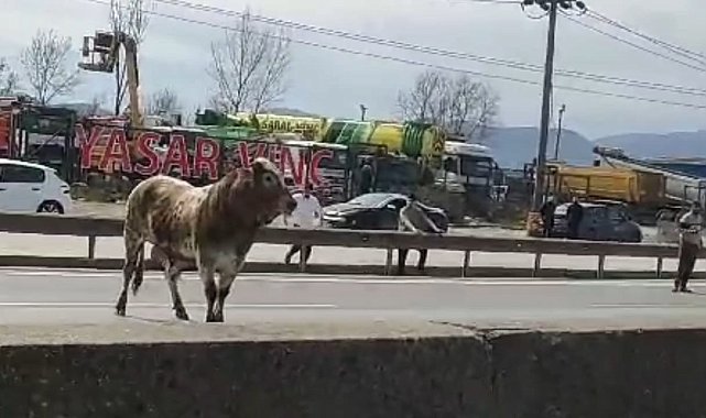 SAKARYA'nın Erenler ilçesinde, sahibinin elinden kaçan boğa, trafiği birbirine kattı. Bir araca zarar veren boğa, bir kadın ve çocuğun da hafif yaralanmasına neden oldu.Erenler Mahallesinde öğle saatlerinde sahibinin elinden kaçıp D100 kara yoluna çıkan boğa, Pekşenler mevkisinde trafiği birbirine kattı. Yoğun araç akışının bulunduğu güzergahta trafik durma noktasına gelirken, boğayı yakalamak için ekipler seferber oldu. Polis ekipleri önlem alarak trafiği durdurdu. Daha sonra boğa demir bariyerlerden atlayarak D-100 karayolundan yan yola kaçtı. Kimseyi yanına yaklaştırmayan boğa, polis aracına zarar verirken, girdiği lastikçi dükkanında bir kadın ve çocuğa çarparak hafif yaralanmasına neden oldu. Sürücülere ve vatandaşlara zor anlar yaşatan boğa, 7 uyuşturucu iğne ile sakinleştirilerek boş bir arazide sahipleri tarafından yakalandı.