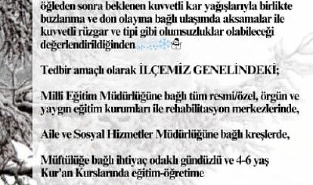 SAMSUN'un Vezirköprü ve Kavak ilçelerinde beklenen kar yağışı, buzlanma ve tipi nedeniyle eğitim-öğretime bugün öğleden sonra ara verildi.Meteoroloji 10'uncu Bölge Müdürlüğü'nün uyarılarının ardından, Vezirköprü ve Kavak kaymakamlıkları, olumsuz hava koşulları sebebiyle ilçede tedbir amaçlı eğitime ara verildiğini duyurdu. Yapılan açıklamalarda, cuma günü öğleden sonra başlaması beklenen yoğun kar yağışıyla buzlanma, don ve kuvvetli rüzgar nedeniyle ulaşımda aksamalar yaşanabileceği belirtildi. Açıklamada ayrıca, "İlçe genelinde; Milli Eğitim Müdürlüğü'ne bağlı tüm resmi/özel, örgün ve yaygın eğitim kurumları ile rehabilitasyon merkezlerinde, Aile ve Sosyal Hizmetler Müdürlüğü'ne bağlı kreşlerde, Müftülüğe bağlı ihtiyaç odaklı gündüzlü ve 4-6 yaş Kur'an kurslarında 11 Nisan 2025 Cuma günü öğleden sonra (yarım gün) eğitim-öğretime ara verilmiştir" ifadelerine yer verildi.