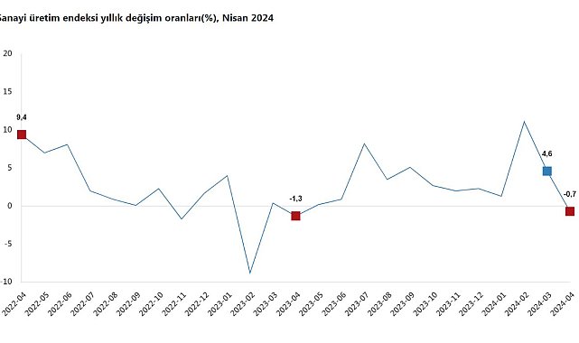 TÜRKİYE İstatistik Kurumu (TÜİK), sanayi üretiminin nisan ayında bir önceki yılın aynı ayına göre yüzde 0,7, bir önceki aya göre yüzde 4,9 azaldığını açıkladı.TÜİK, Nisan 2024 dönemine ilişkin sanayi üretim endeksi verilerini açıkladı. Buna göre; sanayi üretimi nisan ayında bir önceki yılın aynı ayına göre yüzde 0,7 azaldı. Sanayinin alt sektörleri incelendiğinde, madencilik ve taş ocakçılığı sektörü endeksi bir önceki yılın aynı ayına göre yüzde 12,2 arttı, imalat sanayi sektörü endeksi yüzde 1,5 azaldı ve elektrik, gaz, buhar ve iklimlendirme üretimi ve dağıtımı sektörü endeksi yüzde 1,6 arttı.Sanayi üretimi nisan ayında bir önceki aya göre yüzde 4,9 azaldı. Sanayinin alt sektörleri incelendiğinde, madencilik ve taş ocakçılığı sektörü endeksi bir önceki aya göre yüzde 1,3, imalat sanayi sektörü endeksi yüzde 5,3 ve elektrik, gaz, buhar ve iklimlendirme üretimi ve dağıtımı sektörü endeksi yüzde 2,7 azaldı.