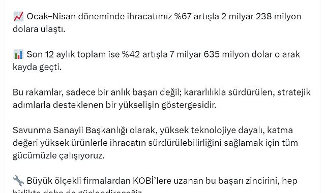 SAVUNMA Sanayii Başkanı Haluk Görgün, savunma ve havacılık sanayi ihracatının nisan ayında yüzde 54 artışla 539 milyon dolar olarak gerçekleştiğini duyurdu.Savunma Sanayii Başkanı Görgün, sosyal medya hesabından yaptığı açıklamada, savunma ve havacılık sanayii ihracatında yeni zirvenin gerçekleştiğini belirterek, "2025 yılı Nisan ayında, savunma ve havacılık sanayiimiz yüzde 54 artışla 539 milyon dolarlık ihracat gerçekleştirdi. Ocak-nisan döneminde ihracatımız yüzde 67 artışla 2 milyar 238 milyon dolara ulaştı. Son 12 aylık toplam ise yüzde 42 artışla 7 milyar 635 milyon dolar olarak kayda geçti. Bu rakamlar, sadece bir anlık başarı değil; kararlılıkla sürdürülen, stratejik adımlarla desteklenen bir yükselişin göstergesidir. Savunma Sanayii Başkanlığı olarak, yüksek teknolojiye dayalı, katma değeri yüksek ürünlerle ihracatın sürdürülebilirliğini sağlamak için tüm gücümüzle çalışıyoruz. Büyük ölçekli firmalardan KOBİ'lere uzanan bu başarı zincirini, hep birlikte daha da güçlendireceğiz. Emeği geçen sanayicilerimizi, emekçilerimizi ve tüm paydaşlarımızı yürekten tebrik ediyorum. Milli teknolojilerle büyüyen bir Türkiye için durmadan çalışmaya devam" ifadelerini kullandı.