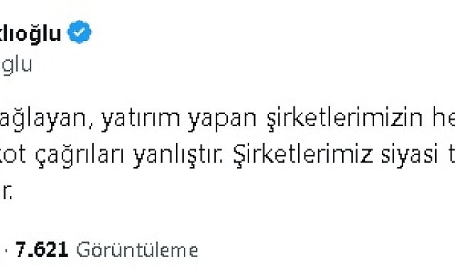 TÜRKİYE Odalar ve Borsalar Birliği (TOBB) Yönetim Kurulu Başkanı, Rıfat Hisarcıoğlu, üreten ve istihdam sağlayan yerli şirketlere yönelik boykot çağrılarının yanlış olduğunu ifade etti.TOBB Başkanı Rıfat Hisarcıoğlu, sosyal medya hesabından yaptığı açıklamada, "Üreten, istihdam sağlayan, yatırım yapan şirketlerimizin hedef haline getirilmesi ve boykot çağrıları yanlıştır. Şirketlerimiz siyasi tartışmaların dışında tutulmalıdır" ifadelerini kullandı.
