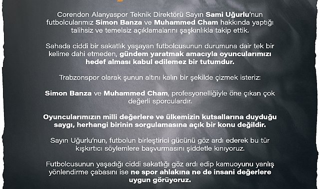 TRABZONSPOR, Türkiye Kupası A Grubu'nun ilk haftasında sahasında ağırladığı Alanyaspor'u 3-0 mağlup ettiği karşılaşmanın ardından yaşanan olaylara ilişkin açıklama yaptı. Bordo-mavili kulüpten yapılan açıklamada, karşılaşma sonrası yaşanan olayların ardından konuk ekip Alanyaspor'un teknik direktörü Sami Uğurlu'nun basın toplantısında Simon Banza ve Muhammed Cham'a ilişkin sarf ettiği sözleri talihsiz ve temelsiz olarak nitelendirildi. Açıklamada şu ifadelere yer verildi: "Corendon Alanyaspor Teknik Direktörü Sayın Sami Uğurlu'nun futbolcularımız Simon Banza ve Muhammed Cham hakkında yaptığı talihsiz ve temelsiz açıklamalarını şaşkınlıkla takip ettik. Sahada ciddi bir sakatlık yaşayan futbolcusunun durumuna dair tek bir kelime dahi etmeden, gündem yaratmak amacıyla oyuncularımızı hedef alması kabul edilemez bir tutumdur. Trabzonspor olarak şunun altını kalın bir şekilde çizmek isteriz: Simon Banza ve Muhammed Cham, profesyonelliğiyle öne çıkan çok değerli sporculardır. Oyuncularımızın milli değerlere ve ülkemizin kutsallarına duyduğu saygı, herhangi birinin sorgulamasına açık bir konu değildir. Sayın Uğurlu'nun, futbolun birleştirici gücünü göz ardı ederek bu tür kışkırtıcı söylemlere başvurmasını şiddetle kınıyoruz. Futbolcusunun yaşadığı ciddi sakatlığı göz ardı edip kamuoyunu yanlış yönlendirme çabasını ise ne spor ahlakına ne de insani değerlere uygun görüyoruz. Ayrıca geçmişte hakem ve rakiplere yönelik hakaretleri ve tehdidi nedeniyle 7 maç ceza alan bir teknik adamın spor camiasına ahlak dersi vermesini ise kamuoyunun takdirine bırakıyoruz. Trabzonspor Kulübü olarak, oyuncularımızı bu tür mesnetsiz iddialardan koruyacağımızı kamuoyuna saygıyla duyuruyoruz."