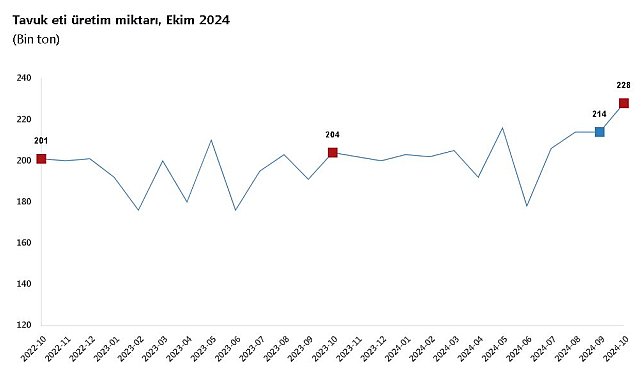 TÜRKİYE İstatistik Kurumu (TÜİK), ekim ayında tavuk eti, yumurta ve içme sütü üretiminin aylık bazda arttığını açıkladı. TÜİK, Ekim 2024 dönemine ilişkin kümes hayvancılığı üretimi ile süt ve süt ürünleri üretimi istatistiklerini açıkladı. Buna göre; bir önceki yılın aynı ayına göre, tavuk yumurtası üretimi yüzde 2,6 arttı, kesilen tavuk sayısı yüzde 9,5 arttı, tavuk eti üretimi yüzde 11,6 arttı, hindi eti üretimi yüzde 0,2 arttı. Ocak-ekim döneminde bir önceki yılın aynı dönemine göre, tavuk yumurtası üretimi yüzde 4,5 arttı, kesilen tavuk sayısı yüzde 7,1 arttı, tavuk eti üretimi yüzde 6,8 arttı, hindi eti üretimi yüzde 15,4 arttı. Tavuk eti üretimi, bir önceki aya göre yüzde 6,3 oranında artarak 227 bin 675 ton oldu. Tavuk yumurtası üretimi yüzde 2,9 oranında artarak 1 milyar 881 milyon 358 bin adet oldu.TOPLANAN İNEK SÜTÜ MİKTARI ARTTITicari süt işletmeleri tarafından toplanan inek sütü miktarı, ekim ayında bir önceki yılın aynı ayına göre yüzde 12,4 arttı. Ocak-ekim döneminde ise bir önceki yılın aynı dönemine göre yüzde 10,1 arttı. Bir önceki yılın aynı ayına göre, inek peyniri üretimi yüzde 7,2 arttı, ayran üretimi yüzde 15,5 arttı, yoğurt üretimi yüzde 8,7 arttı, içme sütü üretimi yüzde 6,4 arttı, tereyağı üretimi yüzde 30,9 arttı. Ocak-ekim döneminde, bir önceki yılın aynı dönemine göre, inek peyniri üretimi yüzde 6,3 arttı, ayran üretimi yüzde 13,2 arttı, yoğurt üretimi yüzde 7,3 arttı, içme sütü üretimi yüzde 4,2 arttı, tereyağı üretimi yüzde 13,5 arttı. Ticari süt işletmelerince toplanan inek sütü miktarı, bir önceki aya göre yüzde 1,9 oranında artarak 921 bin 187 ton oldu. İçme sütü üretimi de bir önceki aya göre yüzde 7,1 oranında artarak 145 bin 7 ton olarak gerçekleşti.