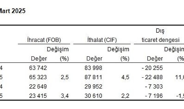 TÜRKİYE İstatistik Kurumu (TÜİK), mart ayında ihracatın bir önceki yılın aynı ayına göre yüzde 3,4, ithalatın yüzde 2,2 arttığını açıkladı.TÜİK, Mart 2025 dönemine ilişkin dış ticaret istatistiklerini açıkladı. Buna göre; 2025 yılı Mart ayında ihracat bir önceki yılın aynı ayına göre yüzde 3,4 artarak 23 milyar 415 milyon dolar, ithalat yüzde 2,2 artarak 30 milyar 610 milyon dolar olarak gerçekleşti. 2025 yılı Ocak-Mart döneminde ihracat bir önceki yılın aynı dönemine göre yüzde 2,5 artarak 65 milyar 323 milyon dolar, ithalat yüzde 4,5 artarak 87 milyar 811 milyon dolar olarak gerçekleşti.DIŞ TİCARET AÇIĞI MART AYINDA AZALDIMart ayında dış ticaret açığı bir önceki yılın aynı ayına göre yüzde 1,5 azalarak 7 milyar 303 milyon dolardan, 7 milyar 196 milyon dolara geriledi. İhracatın ithalatı karşılama oranı 2024 Mart ayında yüzde 75,6 iken, 2025 Mart ayında yüzde 76,5'e yükseldi. Ocak-mart döneminde dış ticaret açığı yüzde 11 artarak 20 milyar 255 milyon dolardan, 22 milyar 488 milyon dolara yükseldi. İhracatın ithalatı karşılama oranı 2024 Ocak-Mart döneminde yüzde 75,9 iken, 2025 yılının aynı döneminde yüzde 74,4'e geriledi.EN FAZLA İHRACAT YAPILAN ÜLKE ALMANYA OLDUMart ayında ihracatta ilk sırayı Almanya aldı. Almanya'ya yapılan ihracat 1 milyar 858 milyon dolar olurken, bu ülkeyi sırasıyla; 1 milyar 507 milyon dolar ile Birleşik Krallık, 1 milyar 416 milyon dolar ile ABD, 1 milyar 237 milyon dolar ile İtalya, 974 milyon dolar ile Fransa takip etti. İlk 5 ülkeye yapılan ihracat, toplam ihracatın yüzde 29,9'unu oluşturdu. Ocak-mart döneminde ihracatta ilk sırayı Almanya aldı. Almanya'ya yapılan ihracat 5 milyar 327 milyon dolar olurken, bu ülkeyi sırasıyla; 4 milyar 31 milyon dolar ile Birleşik Krallık, 3 milyar 981 milyon dolar ile ABD, 3 milyar 310 milyon dolar ile İtalya ve 2 milyar 924 milyon dolar ile Irak takip etti. İlk 5 ülkeye yapılan ihracat, toplam ihracatın yüzde 30,0'unu oluşturdu. İTHALATTA İLK SIRAYI ÇİN ALDIMart ayında ithalatta Çin ilk sırayı aldı. Mart ayında Çin'den yapılan ithalat 4 milyar 6 milyon dolar olurken, bu ülkeyi sırasıyla; 3 milyar 282 milyon dolar ile Rusya Federasyonu, 2 milyar 488 milyon dolar ile Almanya, 1 milyar 525 milyon dolar ile Fransa, 1 milyar 504 milyon dolar ile İtalya izledi. İlk 5 ülkeden yapılan ithalat, toplam ithalatın yüzde 41,8'ini oluşturdu. Ocak-mart döneminde de ithalatta ilk sırayı Çin aldı. Çin'den yapılan ithalat 11 milyar 634 milyon dolar olurken, bu ülkeyi sırasıyla; 11 milyar 541 milyon dolar ile Rusya Federasyonu, 6 milyar 485 milyon dolar ile Almanya, 3 milyar 970 milyon dolar ile ABD, 3 milyar 679 milyon dolar ile İtalya izledi. İlk 5 ülkeden yapılan ithalat, toplam ithalatın yüzde 42,5'ini oluşturdu.