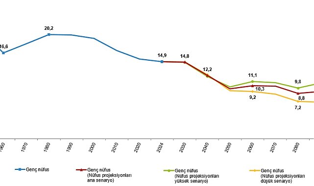 TÜRKİYE İstatistik Kurumu (TÜİK), Türkiye'de geçen yıl itibarıyla genç nüfusun 12 milyon 763 bin 159 kişi olduğunu, genç nüfusun toplam nüfusa oranının 14,9 olduğunu açıkladı.TÜİK, 19 Mayıs Atatürk'ü Anma, Gençlik ve Spor Bayramı'na özel olarak hazırlanan 'İstatistiklerle Gençlik, 2024' bültenini yayımladı. Buna göre; 2024 yıl sonu itibarıyla Türkiye'nin toplam nüfusu 85 milyon 664 bin 944 kişi, 15-24 yaş grubundaki genç nüfus 12 milyon 763 bin 159 kişi oldu. Genç nüfus, toplam nüfusun yüzde 14,9'unu oluşturdu. Genç nüfusun da yüzde 51,2'sini erkek, yüzde 48,8'ini kadınlar oluşturdu. Genç nüfus, 1950 yılında toplam nüfusun yüzde 20,8'ini oluştururken bu oran, 2024 yılında yüzde 14,9 oldu. Nüfus projeksiyonlarının demografik göstergelerdeki mevcut yapının devam edeceğini varsayan ana senaryosuna göre, genç nüfus oranının 2030 yılında yüzde 14,8, 2040 yılında yüzde 12,2, 2060 yılında yüzde 10,3, 2080 yılında yüzde 8,8 ve 2100 yılında yüzde 9,6 olacağı öngörüldü. Doğurganlık göstergelerindeki hızlı düşüş eğiliminin devam edeceğini varsayan düşük senaryoya göre, genç nüfus oranının 2030 yılında yüzde 14,8, 2040 yılında yüzde 12,4, 2060 yılında yüzde 9,2, 2080 yılında yüzde 7,2, 2100 yılında yüzde 7,2 olacağı öngörüldü. Doğurganlığı artırıcı tedbirlerin etkili olacağını varsayan yüksek senaryoya göre ise genç nüfus oranının 2030 yılında yüzde 14,8, 2040 yılında yüzde 12, 2060 yılında yüzde 11,1, 2080 yılında yüzde 9,8, 2100 yılında yüzde 11,4 olacağı öngörüldü.TÜRKİYE'NİN GENÇ NÜFUS ORANI AB ÜYE ÜLKELERİNDEN YÜKSEKAvrupa Birliği (AB) üyesi 27 ülkenin genç nüfus oranları incelendiğinde, 2024 yılında genç nüfus ortalaması yüzde 10,7 oldu. AB üye ülkeleri arasında en yüksek genç nüfus oranına sahip olan ülkelerin sırasıyla yüzde 12,6 ile İrlanda, yüzde 12,3 ile Hollanda ve yüzde 12,2 ile Danimarka olduğu görüldü. Genç nüfus oranının en düşük olduğu ülkeler ise sırasıyla yüzde 9,2 ile Bulgaristan, yüzde 9,5 ile Litvanya, yüzde 9,7 ile Malta ve Slovenya olduğu görüldü. Türkiye'nin genç nüfus oranı AB üyesi ülkelerle kıyaslandığında ise yüzde 14,9'luk oranla AB üye ülkelerinin genç nüfus oranlarından daha yüksek olduğu görüldü.GENÇ NÜFUS ORANI EN YÜKSEK İL HAKKARİ 2024 yılında genç nüfus oranının en yüksek olduğu il, yüzde 20,8 ile Hakkari oldu. Bu ili yüzde 20,6 ile Şırnak, yüzde 20,3 ile Siirt izledi. Genç nüfus oranının en düşük olduğu il ise yüzde 11,8 ile Balıkesir oldu. Bu ili yüzde 12,1 ile Muğla ve yüzde 12,2 ile Ordu izledi.GENÇ NÜFUSUN YÜZDE 30,5'İ 15-17 YAŞ GRUBUNDA Genç nüfus yaş grubuna göre incelendiğinde, 2024 yılında genç nüfusun yüzde 30,5'inin 15-17 yaş grubunda, yüzde 19,9'unun 18-19 yaş grubunda, yüzde 28,8'inin 20-22 yaş grubunda ve yüzde 20,8'inin ise 23-24 yaş grubunda yer aldığı görüldü.EVLİ GENÇ KADINLARIN ORANI, EVLİ GENÇ ERKEKLERİN 3,5 KATIGenç nüfus yasal medeni duruma göre incelendiğinde, cinsiyetler arasında önemli farklılıklar olduğu görüldü. Genç erkek nüfusun 2024 yılında yüzde 96,6'sının hiç evlenmemiş, yüzde 3,3'ünün evli, yüzde 0,1'inin boşanmış olduğu görülürken, genç kadın nüfusun yüzde 87,8'inin hiç evlenmemiş, yüzde 11,7'sinin evli, yüzde 0,4'ünün ise boşanmış olduğu görüldü.KADINLARDA YÜKSEKÖĞRETİMDE NET OKULLAŞMA ORANI YÜZDE 492022/2023 öğretim yılında yüzde 46 olan yükseköğretim net okullaşma oranı, 2023/2024 öğretim yılında yüzde 42,7 oldu. Yükseköğretim net okullaşma oranı cinsiyete göre incelendiğinde, erkeklerde bu oran yüzde 41,1 iken yüzde 36,7, kadınlarda ise yüzde 51,2 iken yüzde 49 oldu.NE EĞİTİMDE NE İSTİHDAMDA OLAN GENÇLERİN ORANI YÜZDE 22,9Gençlerde iş gücüne katılma oranı, 2023 yılında yüzde 45,6 iken 2024 yılında yüzde 47,2 oldu. Genç erkeklerde iş gücüne katılma oranı 2023 yılında yüzde 57,4 iken 2024 yılında yüzde 59,5, genç kadınlarda ise bu oran 2023 yılında yüzde 33,1 iken 2024 yılında yüzde 34 oldu. Gençlerde işsizlik oranı, 2023 yılında yüzde 17,4 iken 2024 yılında yüzde 16,3 oldu. Genç erkeklerde işsizlik oranı 2023 yılında yüzde 14,3 iken 2024 yılında yüzde 13,1, genç kadınlarda ise bu oran 2023 yılında yüzde 23,2 iken 2024 yılında yüzde 22,3 oldu. Ne eğitimde ne istihdamda olan gençlerin oranı 2023 yılında yüzde 22,5 iken 2024 yılında yüzde 22,9 oldu. Genç erkeklerde ne eğitimde ne istihdamda olanların oranı 2023 yılında yüzde 15,6 iken 2024 yılında yüzde 16,2, genç kadınlarda ise bu oran 2023 yılında yüzde 29,8 iken 2024 yılında yüzde 30,1 oldu.İSTİHDAMDAKİ GENÇLERİN YÜZDE 56,3'Ü HİZMET SEKTÖRÜNDE YER ALDIGenç nüfusun istihdam oranı, 2023 yılında yüzde 37,7 iken 2024 yılında yüzde 39,5'e yükseldi. Genç erkeklerde istihdam oranı 2023 yılında yüzde 49,2 iken 2024 yılında yüzde 51,7, genç kadınlarda ise bu oran 2023 yılında yüzde 25,4 iken 2024 yılında yüzde 26,4 oldu. Genç nüfusun istihdamı sektörlere göre incelendiğinde, istihdam edilen gençlerin 2024 yılında yüzde 13'ünün tarım sektöründe, yüzde 30,7'sinin sanayi sektöründe, yüzde 56,3'ünün ise hizmet sektöründe yer aldığı görüldü. İstihdam edilen genç erkeklerin yüzde 11,8'inin tarım sektöründe, yüzde 35,9'unun sanayi sektöründe, yüzde 52,3'ünün hizmet sektöründe yer aldığı görülürken genç kadınların yüzde 15,4'ünün tarım, yüzde 19,9'unun sanayi, yüzde 64,7'sinin ise hizmet sektöründe yer aldığı görüldü.18 ve daha yukarı yaştaki bireylerin genel sağlık durumlarından memnuniyet oranı 2023 yılında yüzde 69,2 iken 2024 yılında yüzde 67,5 oldu. Genç nüfusun genel sağlık durumundan me