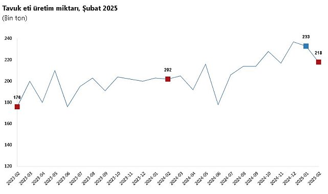 ANKARA, (DHA)- TÜRKİYE İstatistik Kurumu (TÜİK), şubat ayında aylık tavuk eti, tavuk yumurtası ve içme sütü üretim miktarlarının azaldığını açıkladı