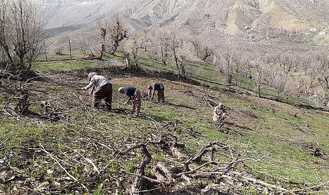 Abdullah KAYA/DERECİK (Hakkari), (DHA)- HAKKARİ'nin Irak sınırında bulunan Derecik ilçesindeki köylerde yaşayanlar, tarla, bahçe hazırlama ve üzüm bağları budama döneminde bölge engebeli olduğundan imece usulü işlerini yapıyor