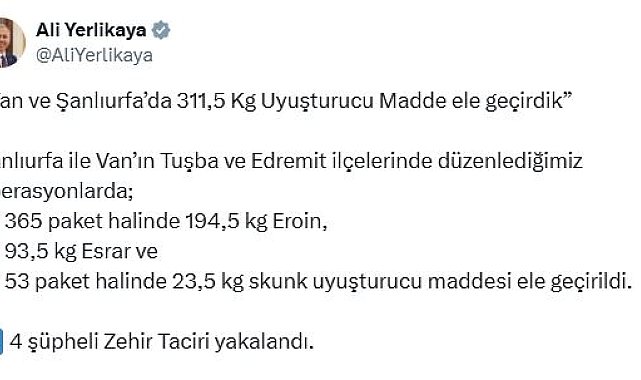 ANKARA, (DHA)- İÇİŞLERİ Bakanı Ali Yerlikaya, Şanlıurfa ile Van'ın Tuşba ve Edremit ilçelerindeki operasyonlarda yüklü miktarda uyuşturucunun ele geçirildiğini ve 4 şüphelinin yakalandığını açıkladı